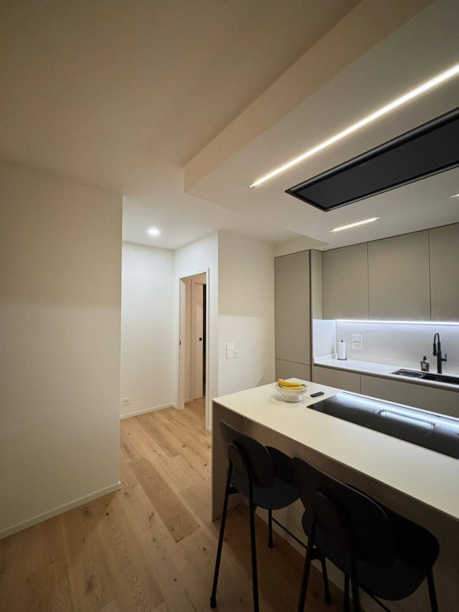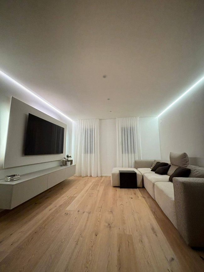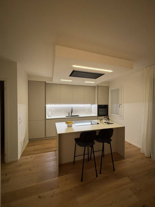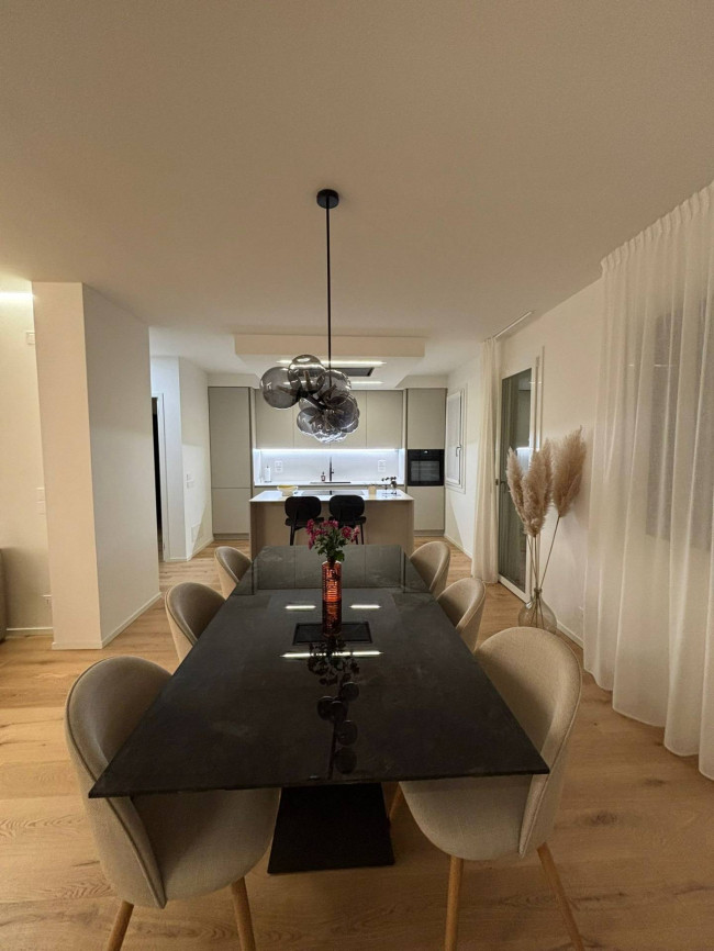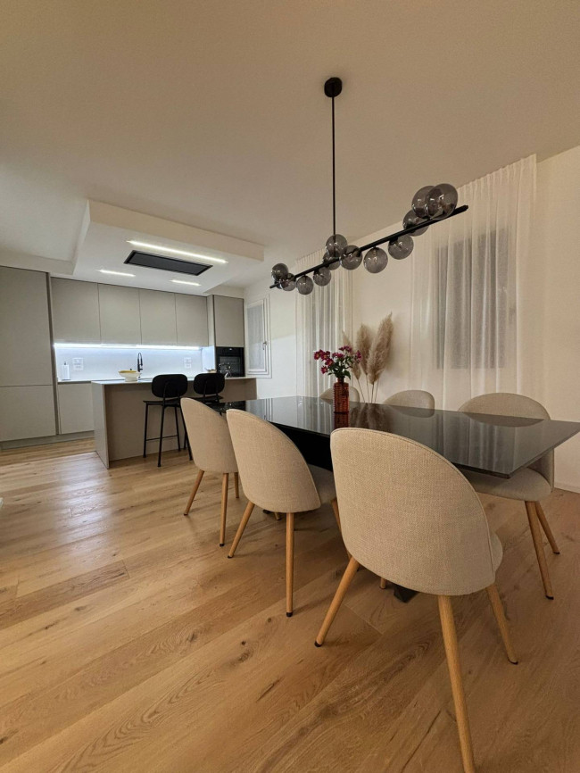 Il cuore della casa è uno straordinario open space: un ambiente arioso e accogliente, impreziosito da pavimenti in rovere massiccio e da una cucina contemporanea con isola centrale e cappa di design. Qui ogni dettaglio è stato studiato per creare un'atmosfera raffinata ma familiare, valorizzata da un'illuminazione LED calda e avvolgente.